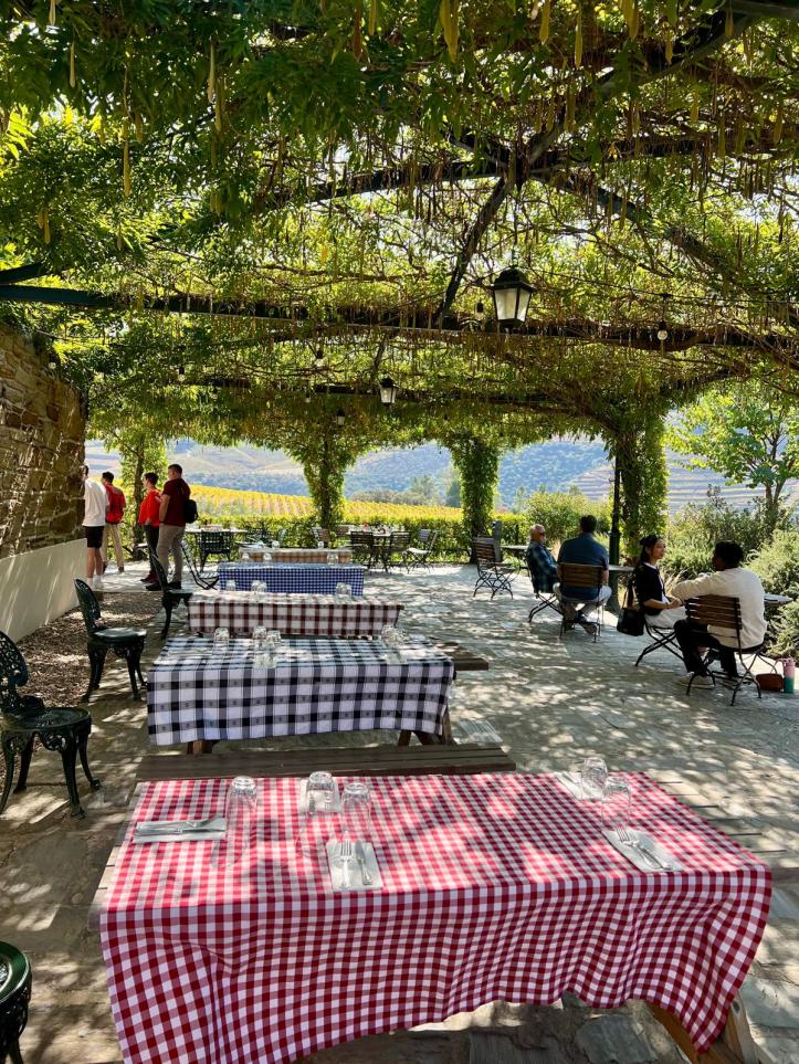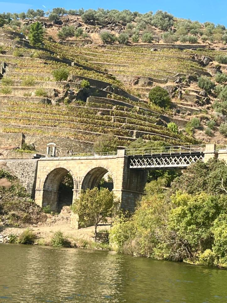 A pretty amazing view of the steep slopes of the Douro Valley showing the vineyards and the terracing. Right in the middle of this photo you will notice that the vineyards sit beneath trees and forests, and apparently some rows of rosemary. We learnt later that there was a sneaky reason for this. The rules for growing grapes here include regulations around irrigation of the vines – which can only occur in the first three years of a vine’s growth and, now as the temperatures have risen, once every two weeks during the strongest heat.