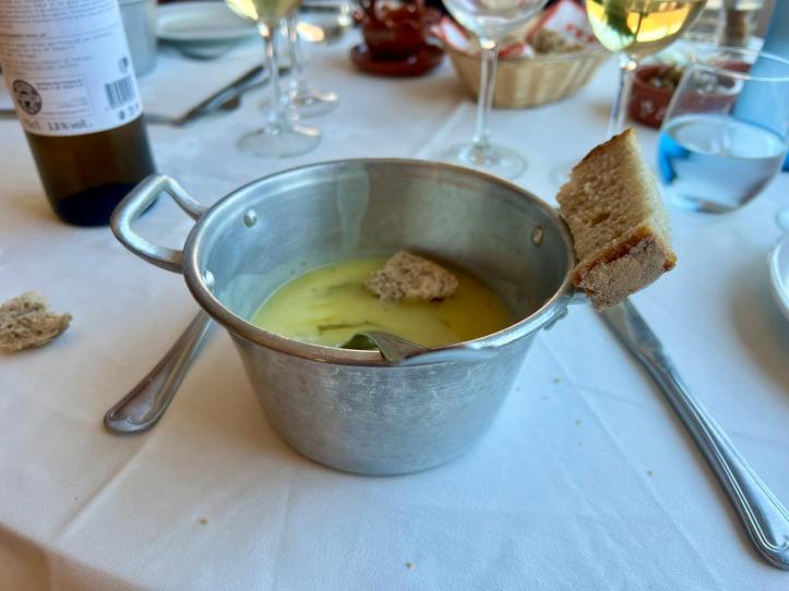 We were then driven back to what André called ‘the farm’ – Quinta de Marrocos, for lunch and a taste of Cézar’s white port. We had a vegetable soup as a starter, served once more in the dish used by the harvest workers, where the handles were used to hold the bread.